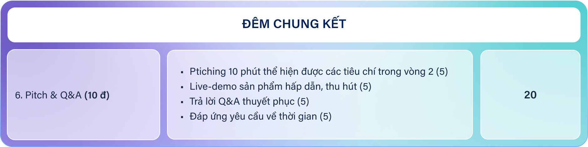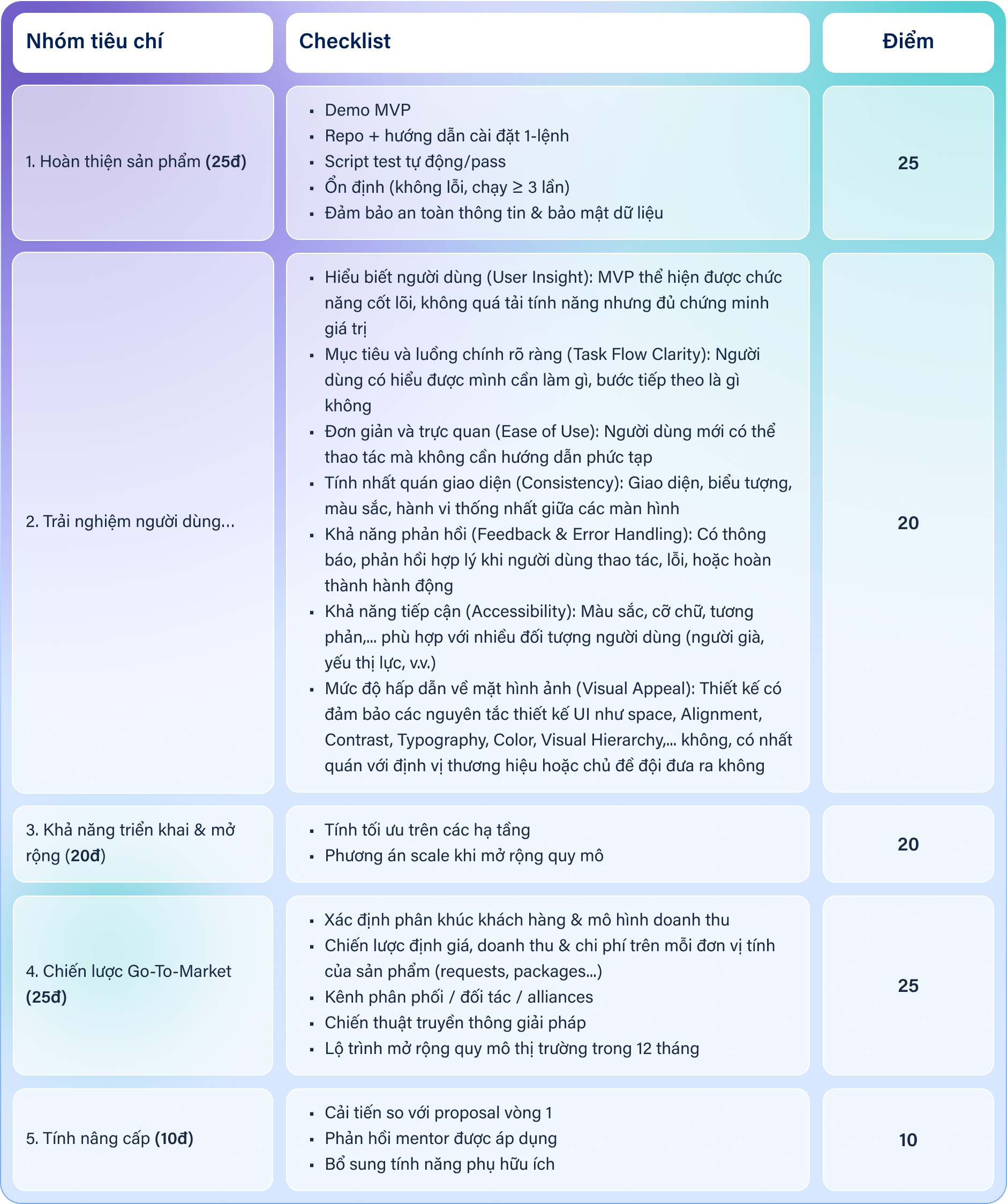 Tại vòng này, đội thi sẽ hiện thực hóa ý tưởng thành một sản phẩm MVP có thể trình diễn. Ban giám khảo sẽ chấm điểm dựa trên độ hoàn thiện, trải nghiệm người dùng, tiềm năng triển khai thực tế và tư duy phát triển sản phẩm. Lựa chọn 05 đội có điểm cao nhất, không vi phạm các quy định, để vào vòng chung kết. Thang điểm tối đa: 100 điểm, gồm các tiêu chí: