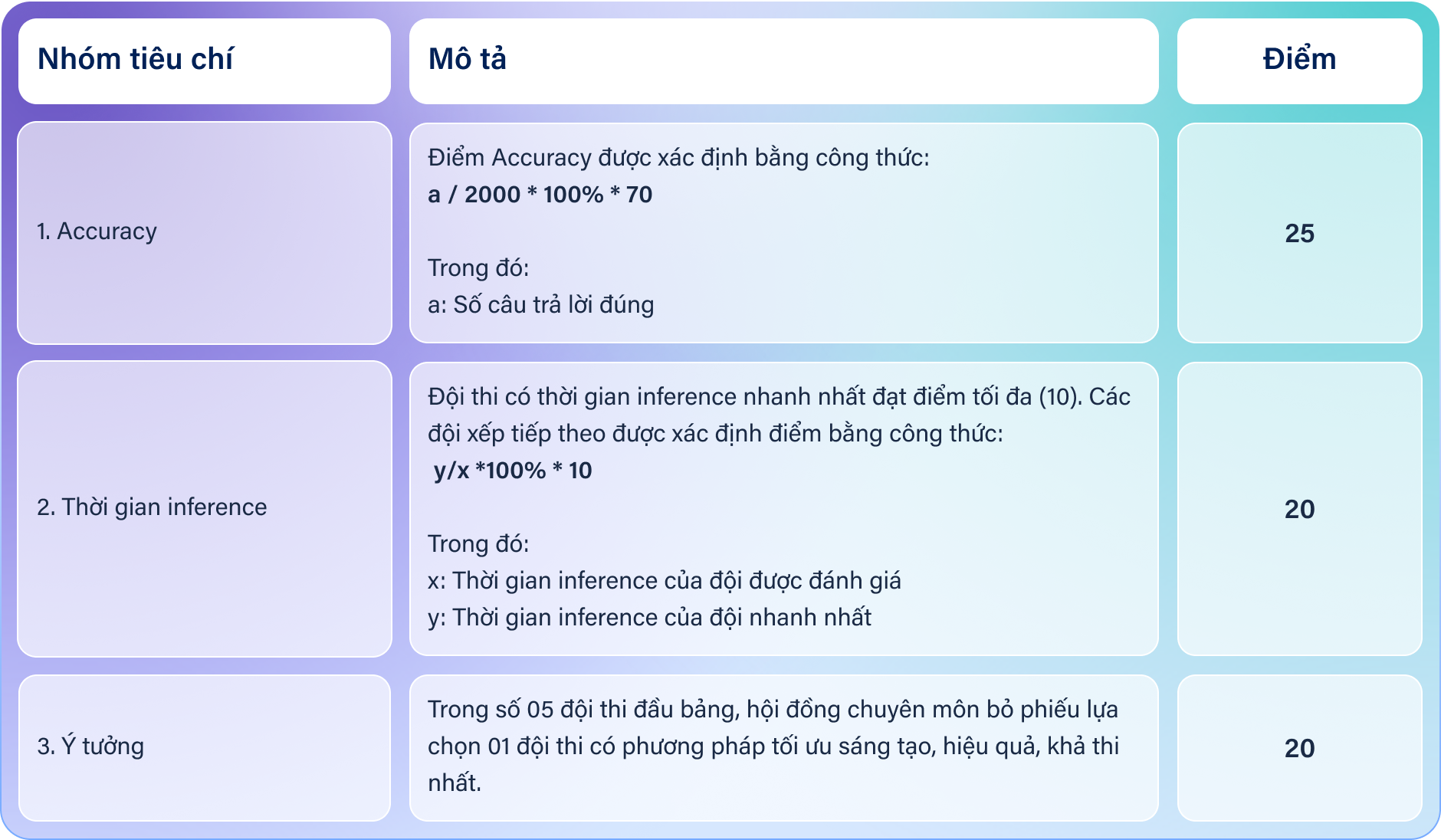 Đội thi nộp phiên bản Docker cuối cùng đã được tinh chỉnh và sẵn sàng kiểm chứng. BTC sẽ thực hiện đánh giá trên bộ private test gồm 2000 câu hỏi, với các tiêu chí:
