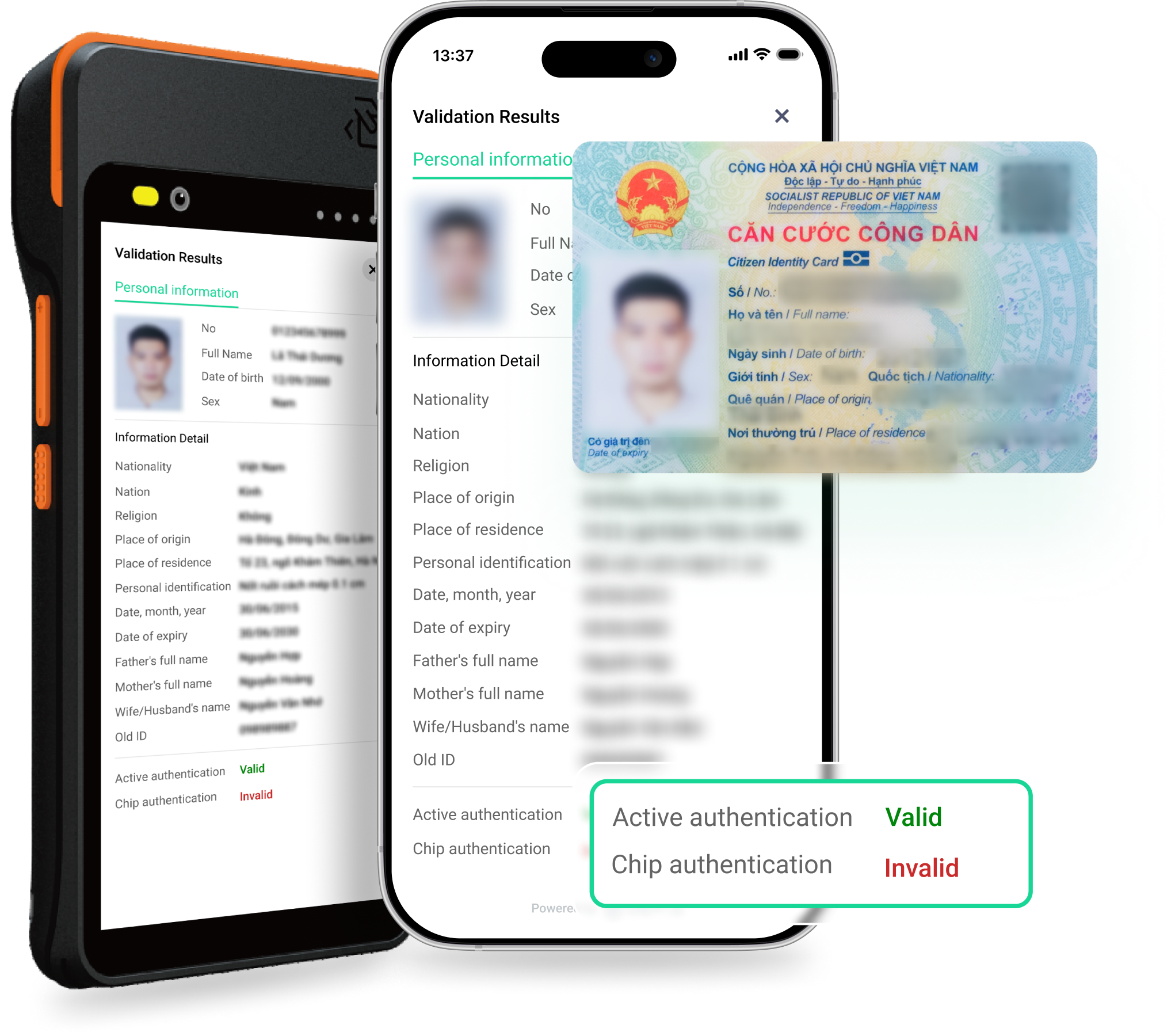 VNPT eKYC IDCheck is a service that verifies the accuracy and integrity of information, and authenticates the signature on chip-based ID cards via the RAR-C06 center of the Ministry of Public Security. IDCheck offers absolute anti-spoofing capability, significantly reduces risks in electronic identity verification transactions, enhances user experience, and supports digital transformation for businesses.