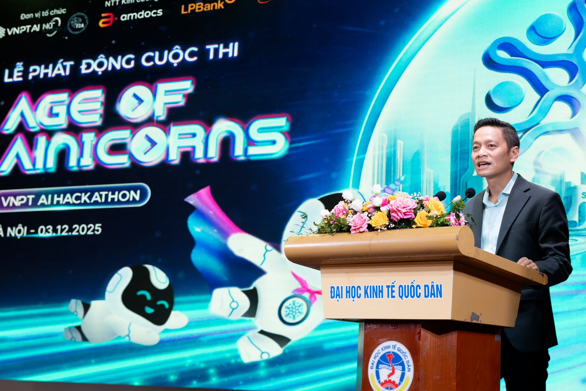 TS. Nguyễn Quang Huy, Hiệu trưởng Trường Công nghệ, khẳng định sự kiện là một minh chứng cho cam kết gắn kết giữa VNPT AI và FDA trong việc đồng hành, hỗ trợ sinh viên phát triển kỹ năng, sản phẩm và tư duy đổi mới sáng tạo. Chính sự phối hợp chặt chẽ giữa các bên là nền tảng quan trọng để những sân chơi như Age of AInicorns trở thành bệ phóng để các bạn trẻ tìm thấy đam mê, rèn luyện kỹ năng và bước vào con đường nghề nghiệp với tâm thế vững vàng.